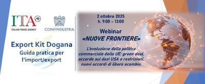 In programma per giovedì 2 ottobre, organizzato da Agenzia ICE e Confindustria, il webinar “Nuove frontiere - L'evoluzione della politica commerciale della UE: green deal, accordo sui dazi USA e restrizioni, ...